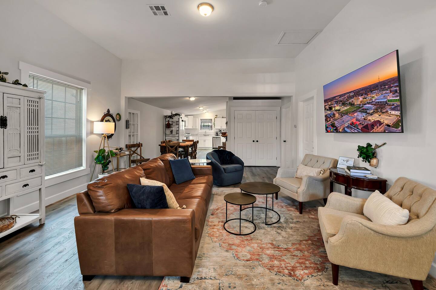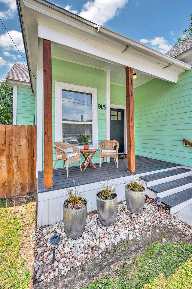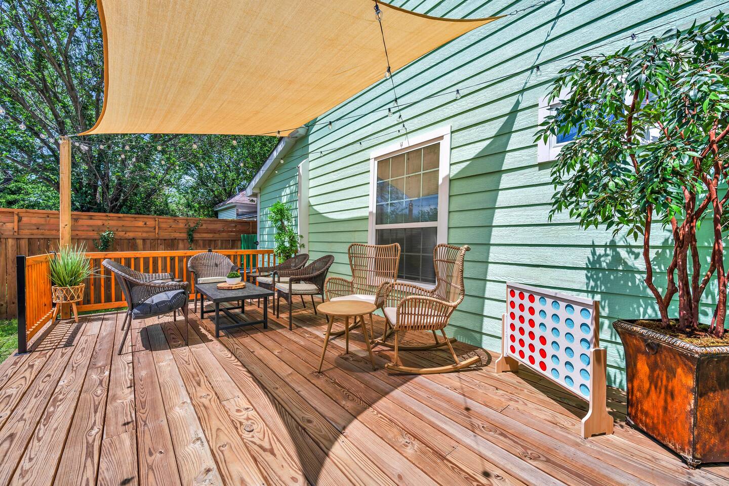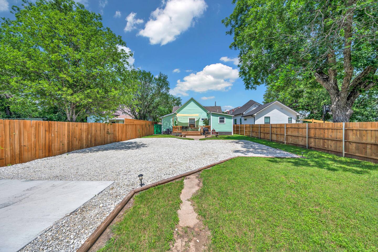 Welcome to the Cozy Mint Cottage—your fresh, stylish escape in one of Waco’s best locations. Just minutes from Magnolia, Baylor University, McLane Stadium, Foster Pavilion, the Silos, and the heart of Downtown, this centrally located gem makes it easy to explore the best of Waco without the hassle of a long drive. Whether you're here for game day, a Magnolia pilgrimage, or a relaxing getaway, this is the perfect home base. Originally built in 1895 and lovingly renovated, this 3-bedroom, 3-bath home blends timeless charm with all the modern comforts. Each spacious bedroom features its own private bathroom and dressing closet with a full-length mirror—plus super comfy beds, soft linens, and thoughtful extras to make you feel right at home. The open-concept layout includes a fully stocked kitchen, a handcrafted dining table with plenty of seating, and a cozy living room with ample seating and a 70” smart TV. The primary bedroom also includes a 40” Roku TV for winding down after a full day in the city. Outside, unwind in the large, fully fenced backyard, complete with private gated parking and a brand-new deck outfitted with rocking chairs, shade sails, and outdoor seating—perfect for a peaceful morning coffee or an evening under the stars. If location matters to you—this is the one. The Cozy Mint Cottage offers comfort, convenience, and charm just steps from the best that Waco has to offer.