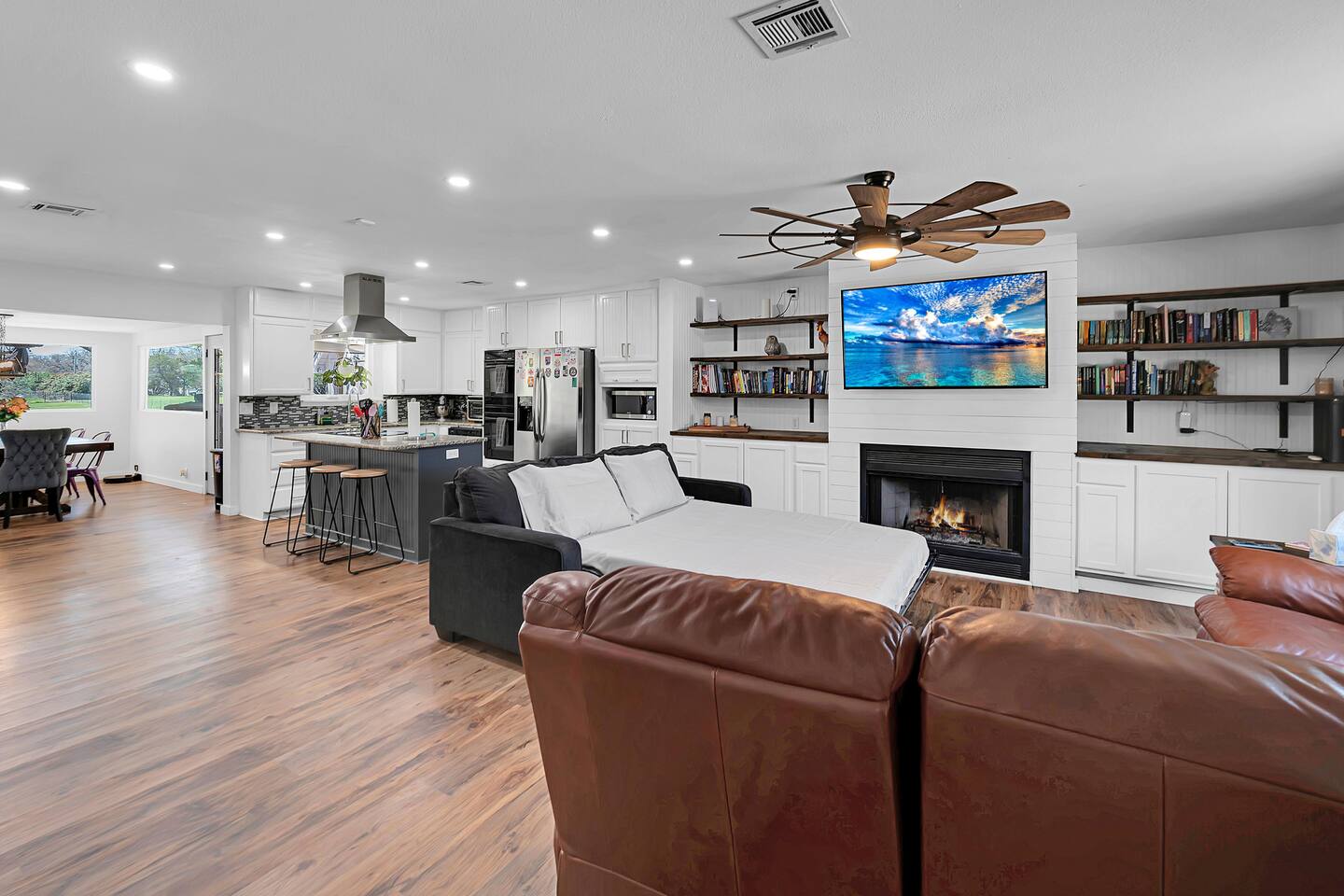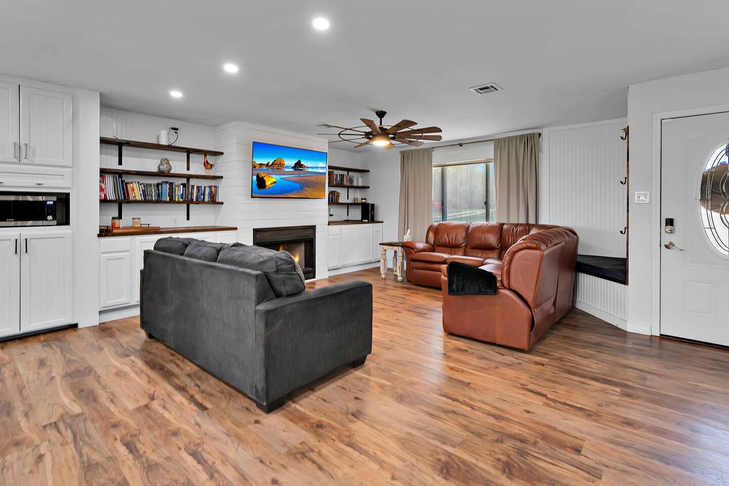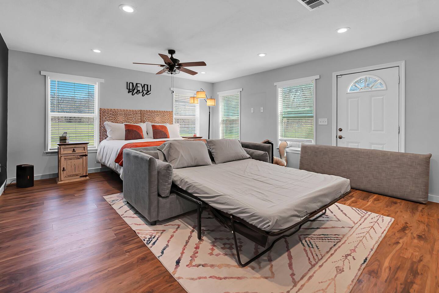 Escape to Heritage Hideaway—just 15 minutes from Waco, this private retreat sleeps 14 across a spacious main house and retro-style guest house. Enjoy wide open spaces, a huge deck, firepit, volleyball net, and peaceful country views. Perfect for family getaways, game weekends, or group gatherings with room to spread out and unwind. Pets welcome with a refundable pet fee.