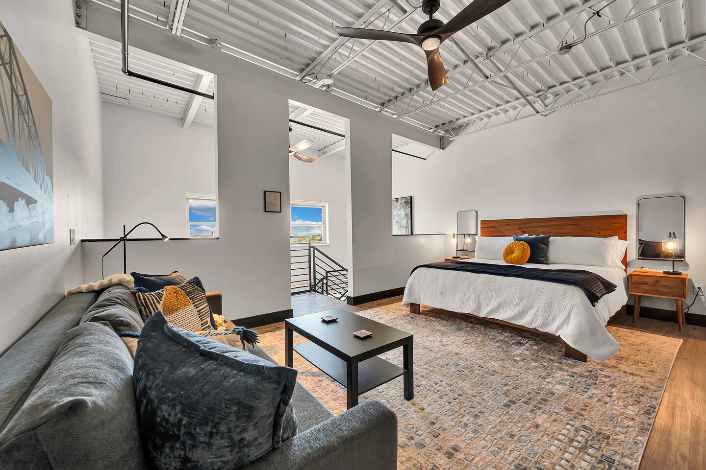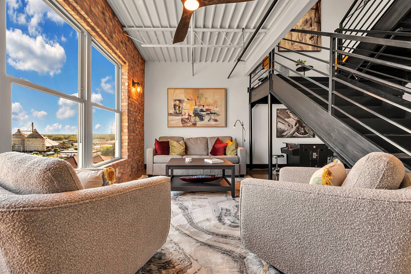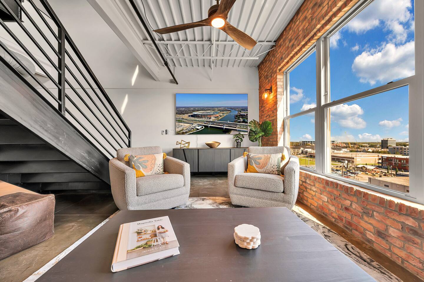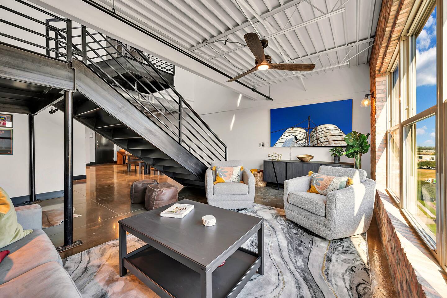 Stay in the heart of Waco at this two-story urban-industrial loft in the historic Behrens Building. Featuring a spacious living area, fully equipped kitchen, automated blinds, and luxurious sleeping options—including a king-size bed and premium sleeper sofas—this suite offers modern comfort with industrial charm. Enjoy stunning views of The Silos and Baylor University, all just steps from Magnolia Silos, the Dr Pepper Museum, and other top Waco attractions.