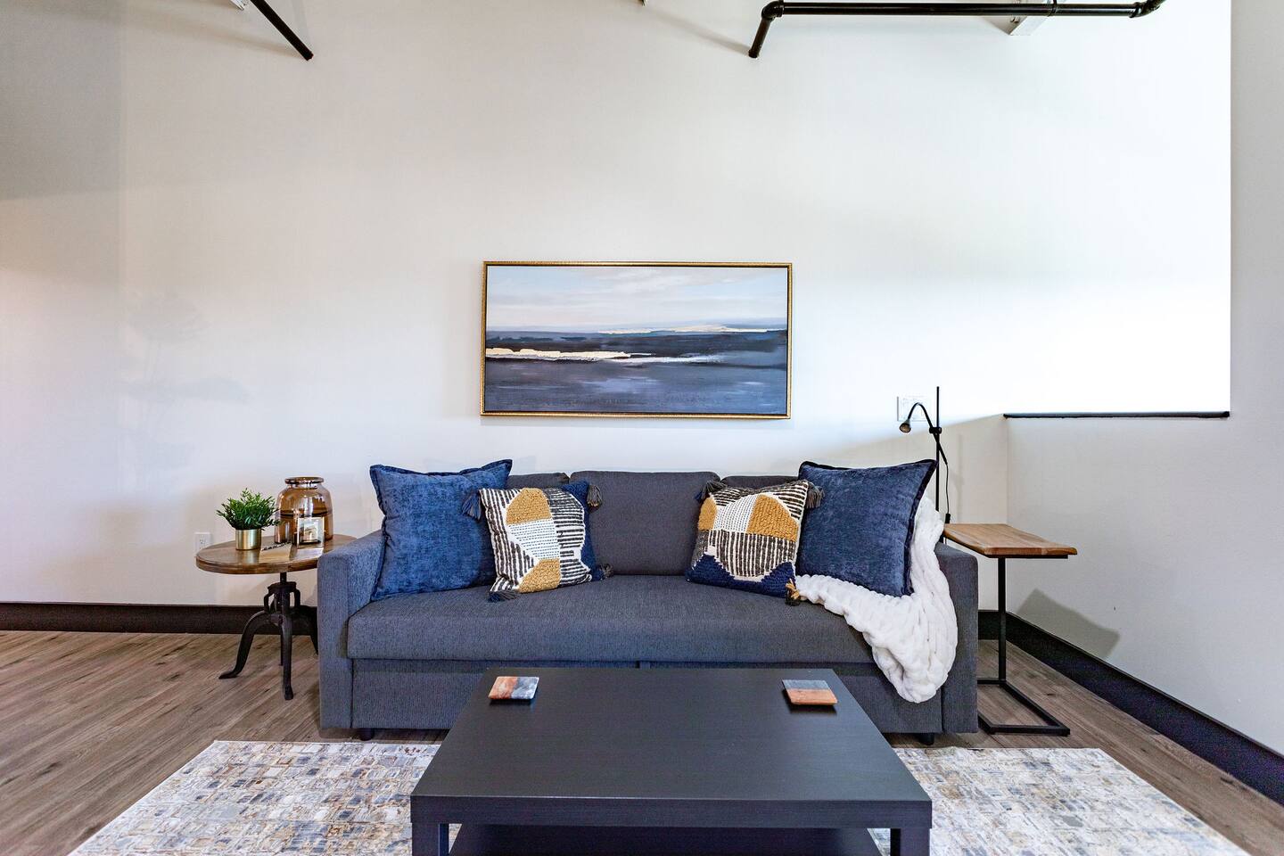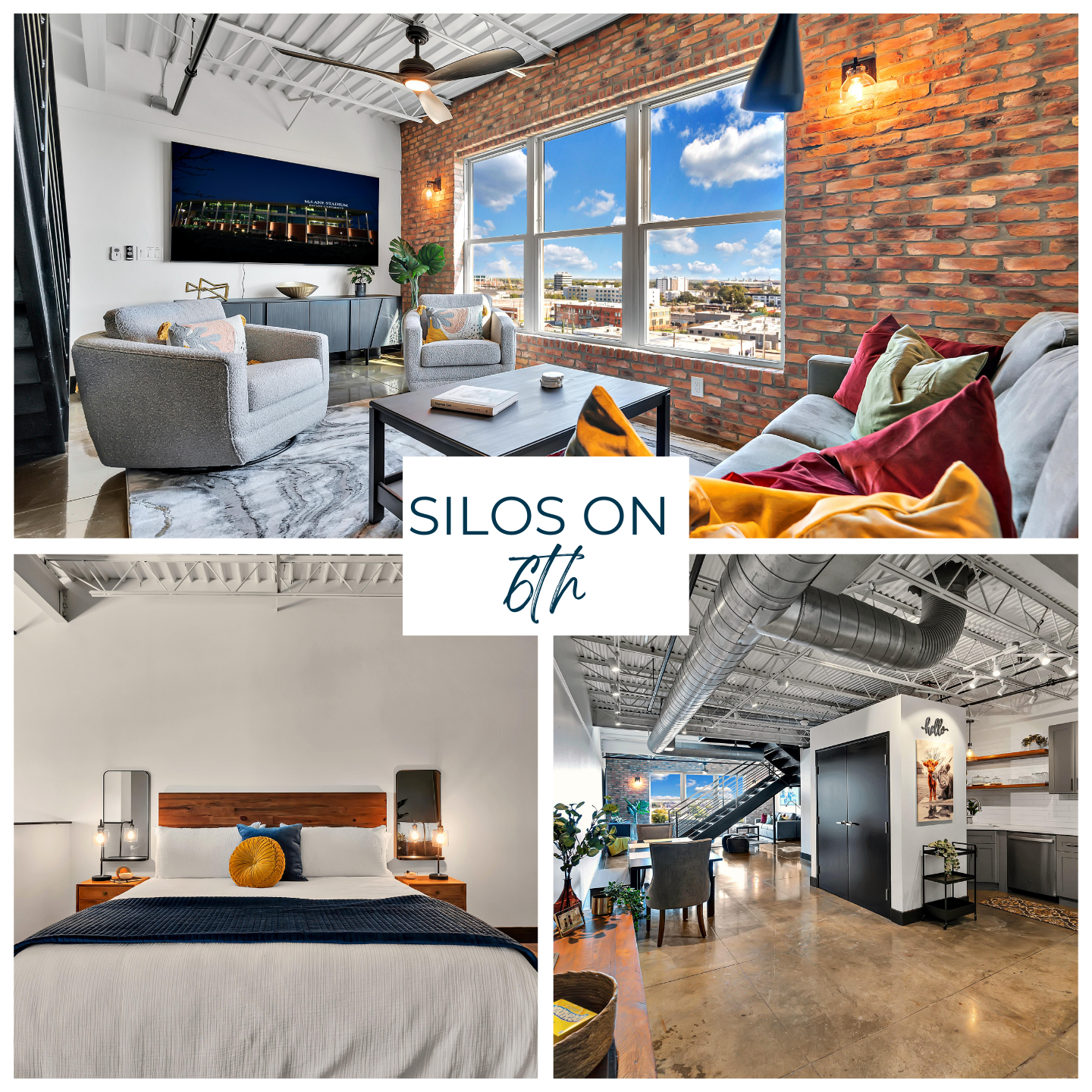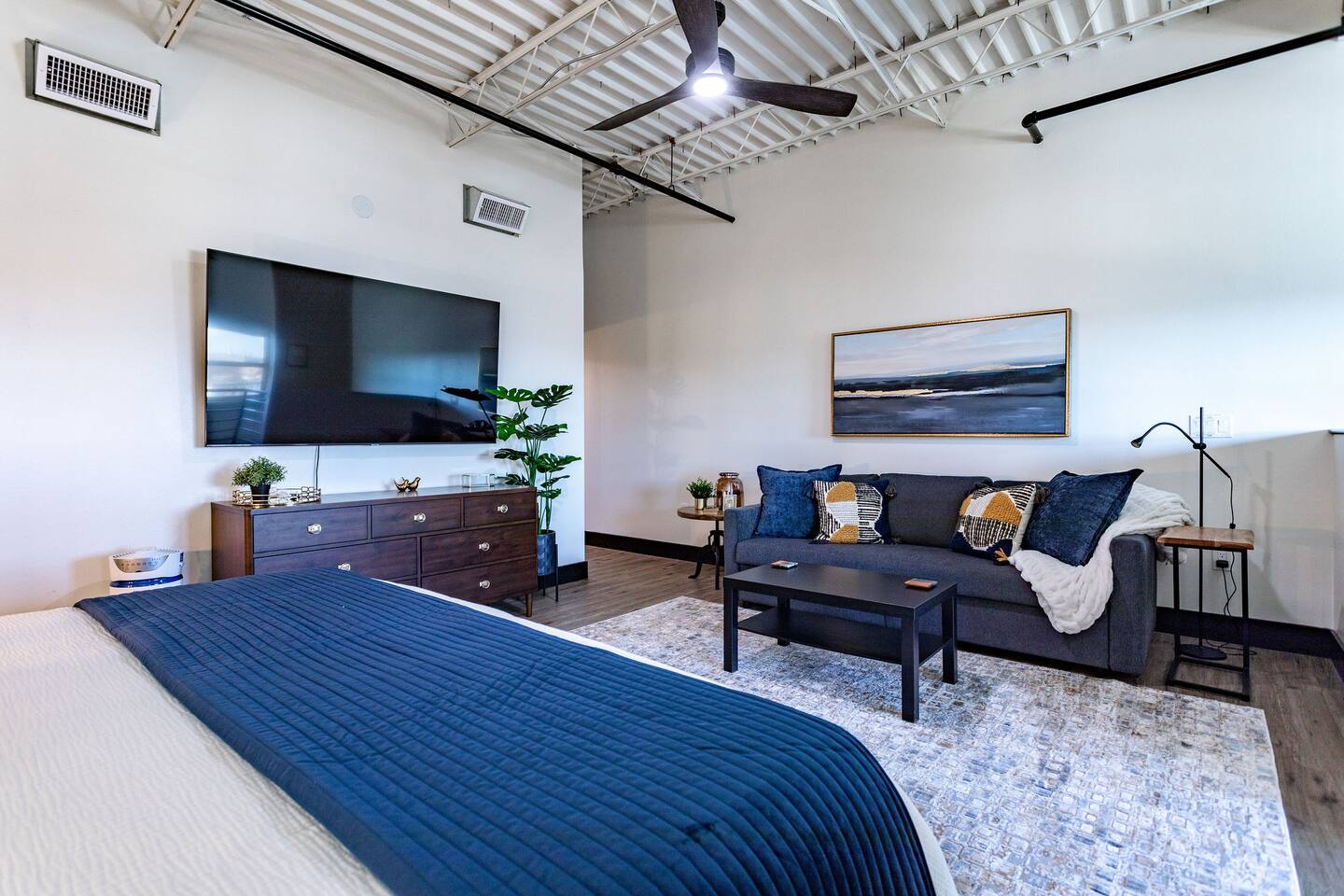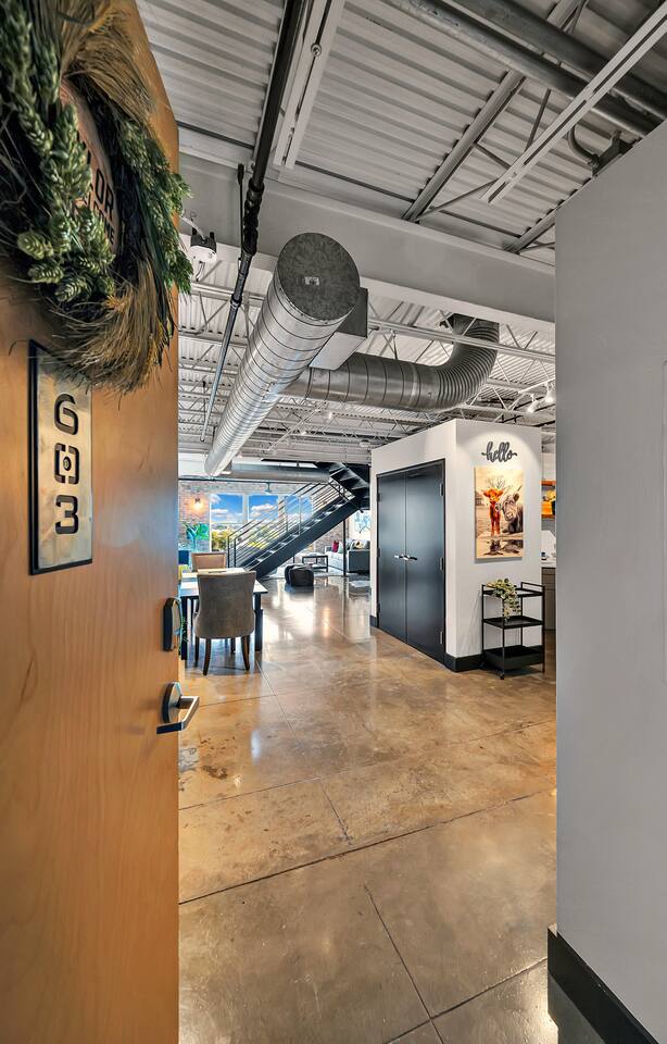 Stay in the heart of Waco at this two-story urban-industrial loft in the historic Behrens Building. Featuring a spacious living area, fully equipped kitchen, automated blinds, and luxurious sleeping options—including a king-size bed and premium sleeper sofas—this suite offers modern comfort with industrial charm. Enjoy stunning views of The Silos and Baylor University, all just steps from Magnolia Silos, the Dr Pepper Museum, and other top Waco attractions.