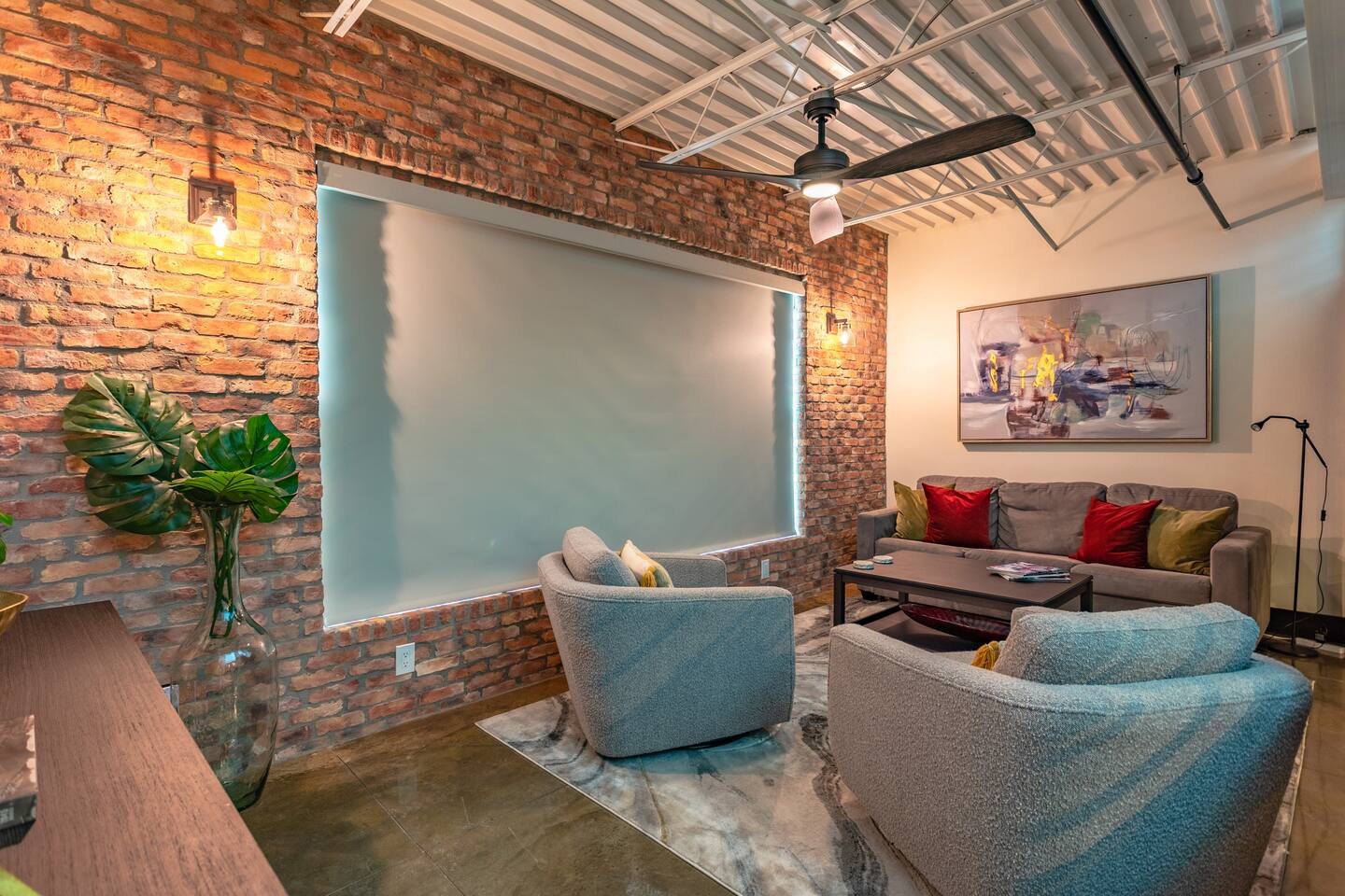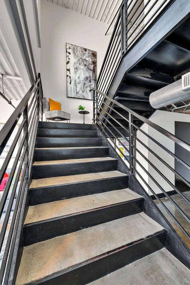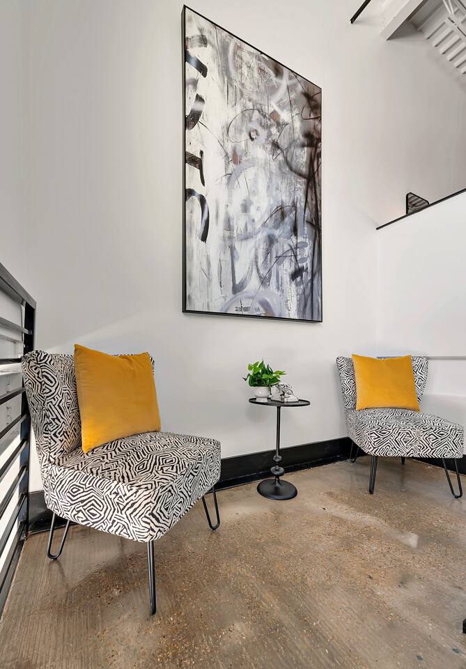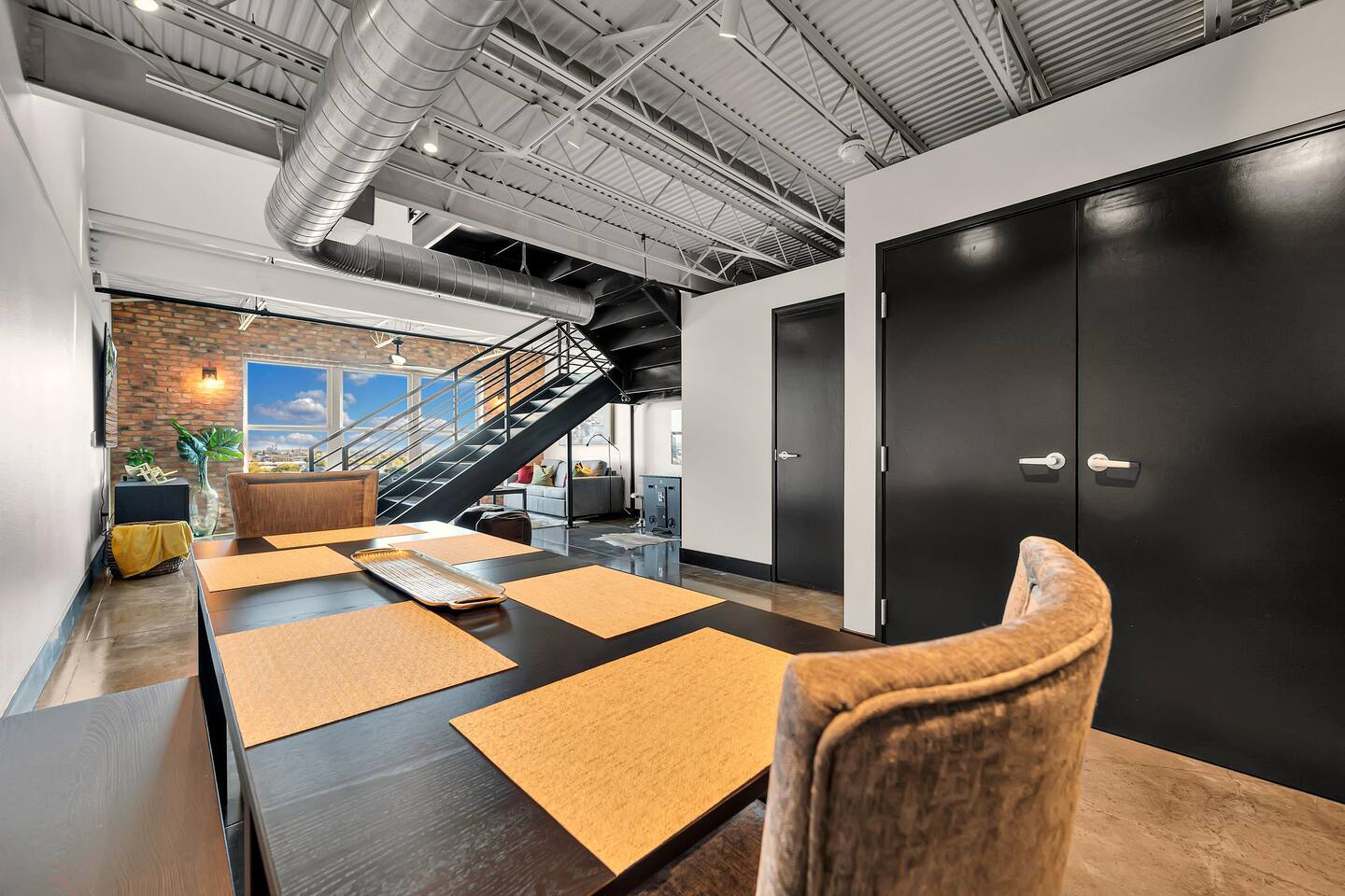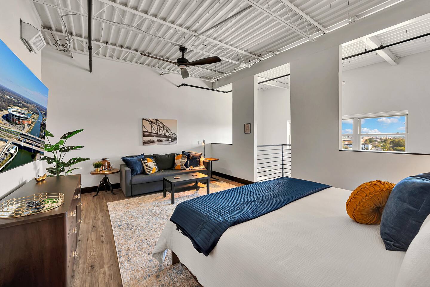 Stay in the heart of Waco at this two-story urban-industrial loft in the historic Behrens Building. Featuring a spacious living area, fully equipped kitchen, automated blinds, and luxurious sleeping options—including a king-size bed and premium sleeper sofas—this suite offers modern comfort with industrial charm. Enjoy stunning views of The Silos and Baylor University, all just steps from Magnolia Silos, the Dr Pepper Museum, and other top Waco attractions.