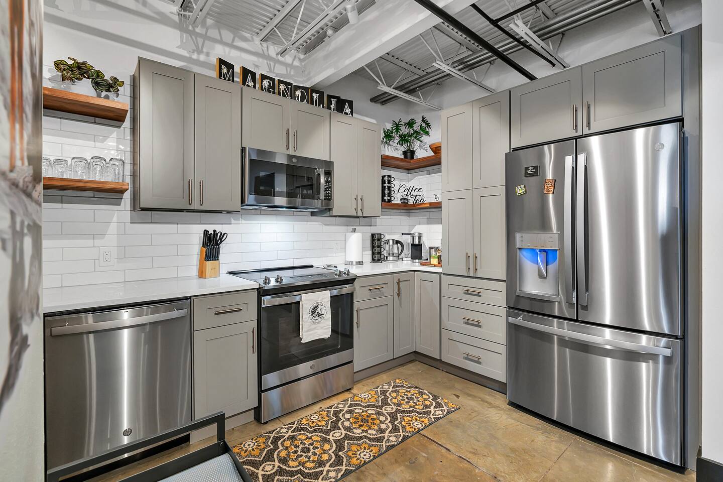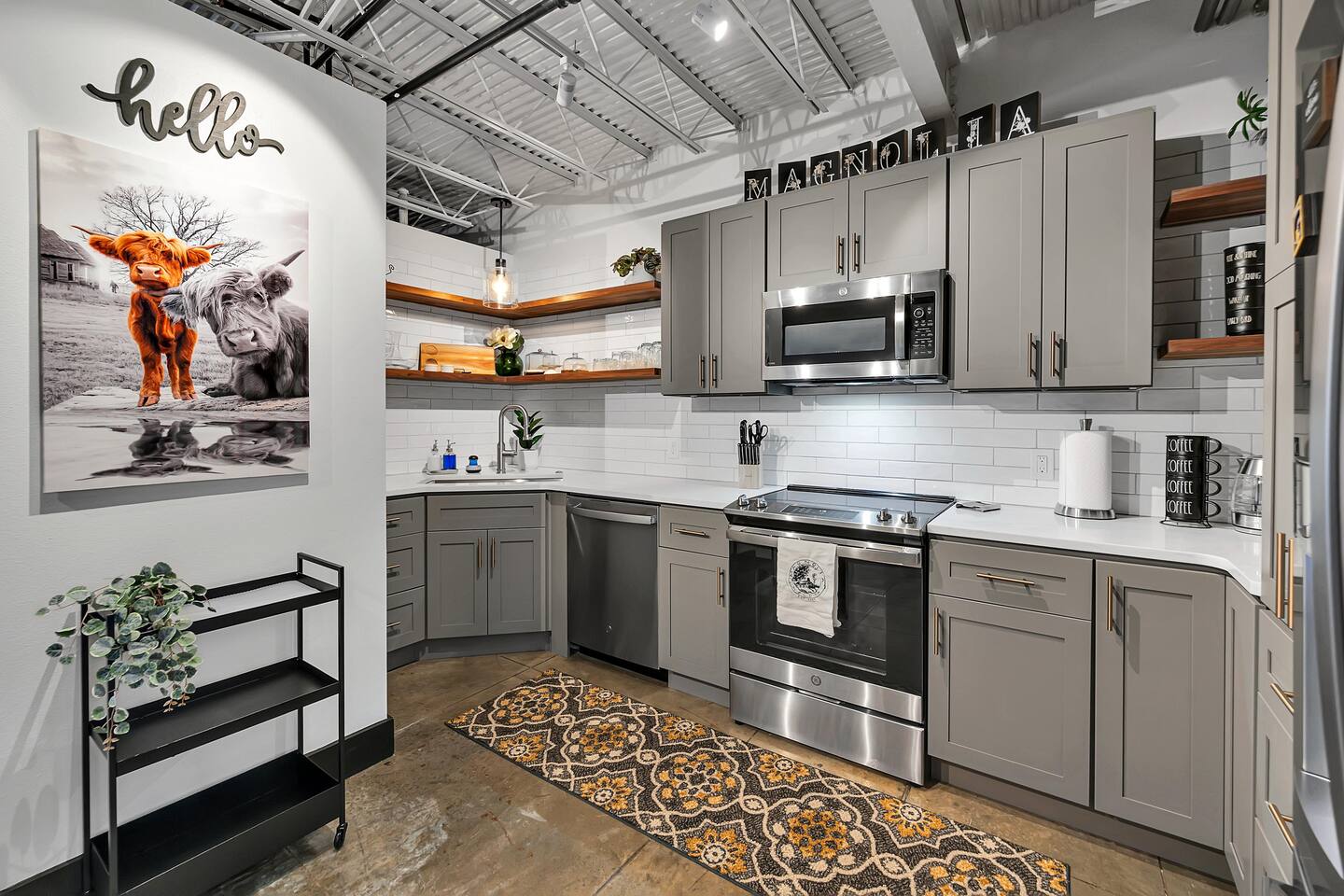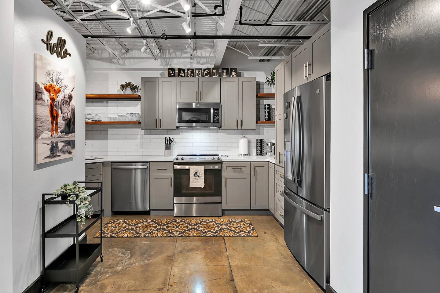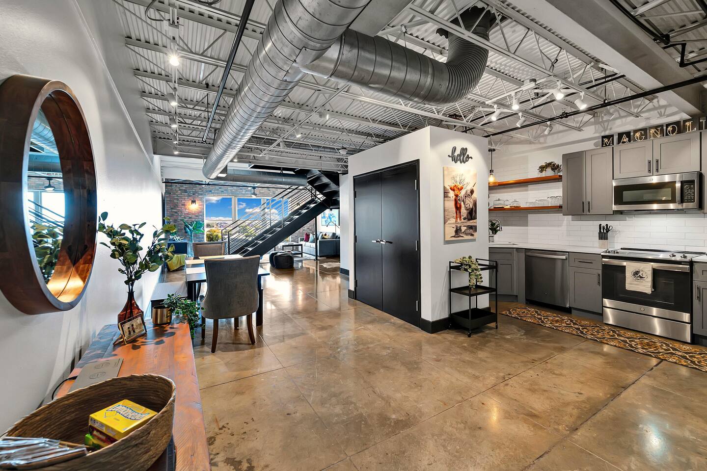 Step into an urban industrial retreat at this stunning lofted suite, located on the top floor of the historic Behrens Building. This two-story condo is the perfect blend of modern comfort and industrial charm, offering unbeatable views of The Silos, Baylor University, and McLane Stadium. Featuring sleek finishes, exposed architectural details, and automated blinds for a seamless touch, this space is designed to elevate your Waco experience. This lofted suite blends a chic industrial vibe with luxurious amenities, offering a truly unique experience. The spacious living area invites you to relax in style with comfortable seating, an 85” TV, and a classic arcade machine (no coins needed!). The fully equipped kitchen is perfect for culinary adventures, featuring modern appliances, ample counter space, and complimentary coffee and snacks. Upstairs, the lofted sleeping area provides a cozy retreat with a plush king-size bed, as well as premium sleeper options like an IKEA Queen and a Palliser Cloud Z Queen for added flexibility. Thoughtful touches, including automated blinds, soft bedding, and breathtaking views, make this space the perfect haven for your Waco getaway. Prime Location Immerse yourself in Waco’s vibrant downtown, with top attractions just steps away: Magnolia Silos: 3 blocks Dr Pepper Museum: Next door Waco Suspension Bridge: 5 blocks Baylor University: 1.5 miles McLane Stadium: 1.6 miles From the urban industrial vibe to its unbeatable location, this lofted suite is your ideal home base for exploring Waco. Whether you’re here for a weekend getaway, a Baylor game, or a Magnolia escape, this condo offers style, comfort, and convenience all in one. Book your stay today and experience Waco like never before! STR001117-10-2022