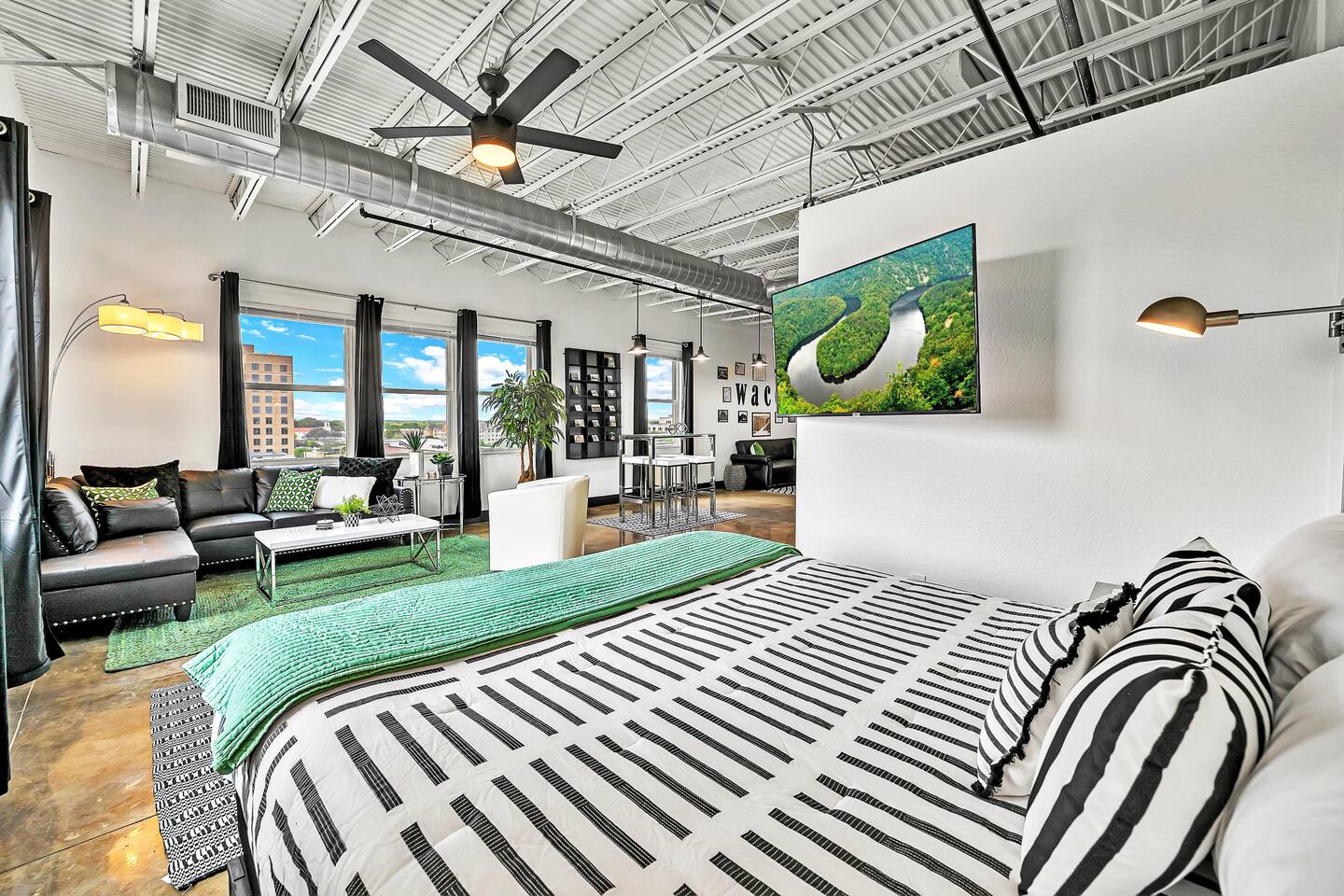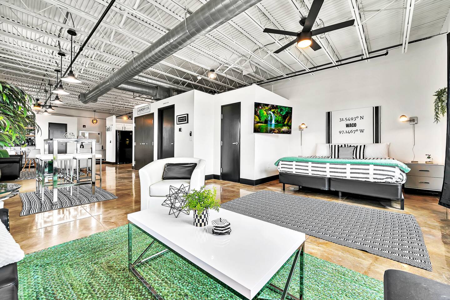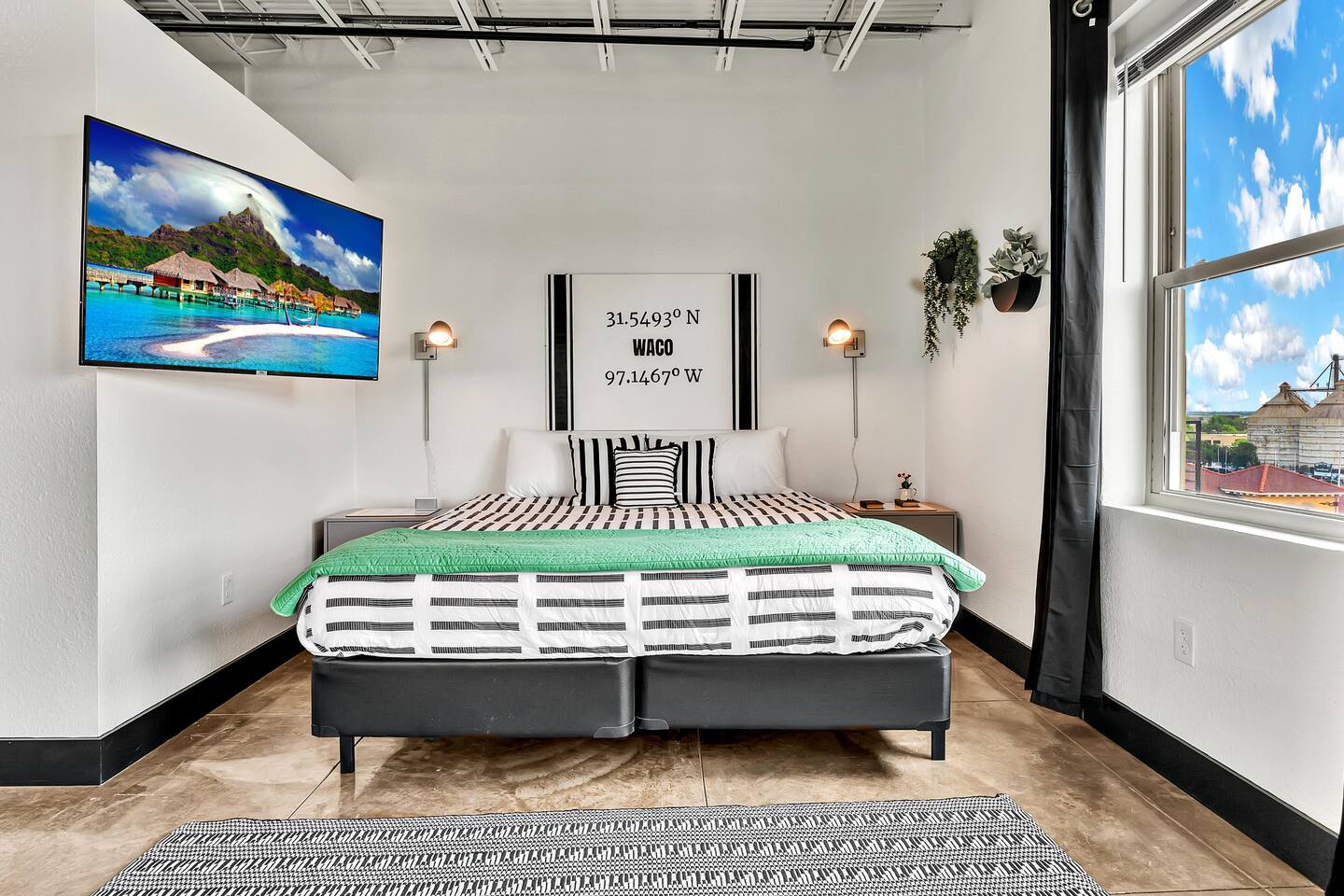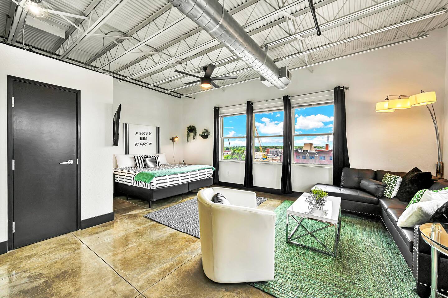 Experience a nostalgic nod to Old Waco at Silo Studio, a beautifully updated loft in the historic Behrens Building—just steps from Magnolia, Baylor, and the heart of downtown. Thoughtfully designed with vintage-inspired touches and modern furnishings, this unique space blends timeless style with everyday comfort. Large, panoramic windows flood the space with natural light and showcase sweeping views of downtown Waco, making it one of the loft’s standout features. Inside, you’ll find an open floor plan, dining space for four, a cozy breakfast nook (or workspace), and plenty of comfortable seating for relaxing and reconnecting. Additional highlights include a luxurious bathroom, free designated parking, and all the amenities you need for a comfortable stay. With its industrial charm and unbeatable location, Silo Studio is the perfect spot to experience Waco in style—whether you’re here for a quick getaway or a longer stay. STR000847-08-2022
