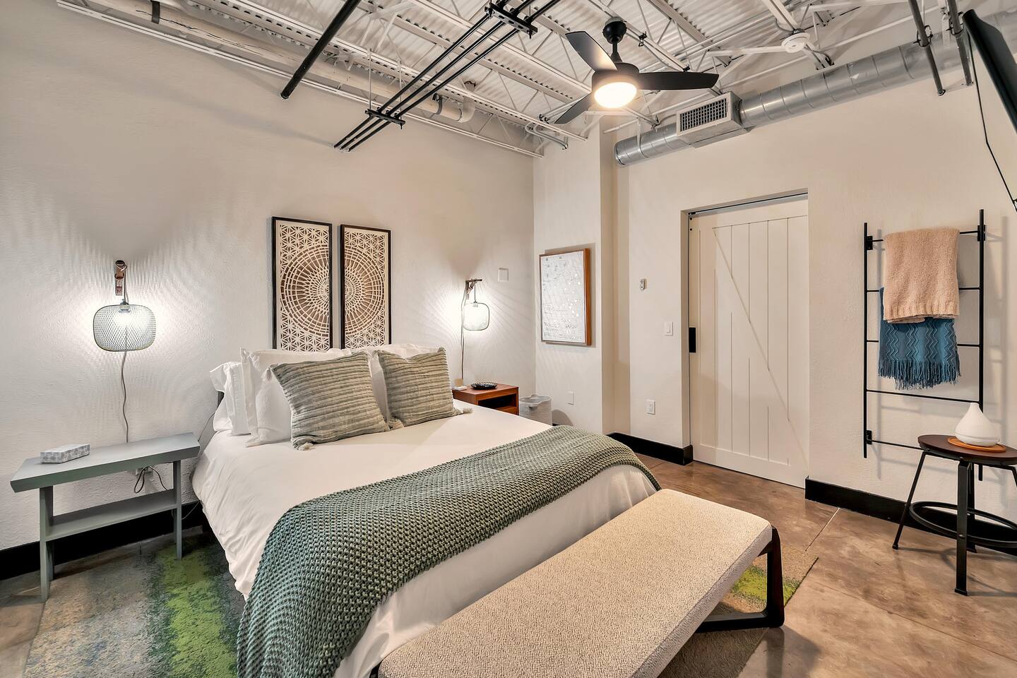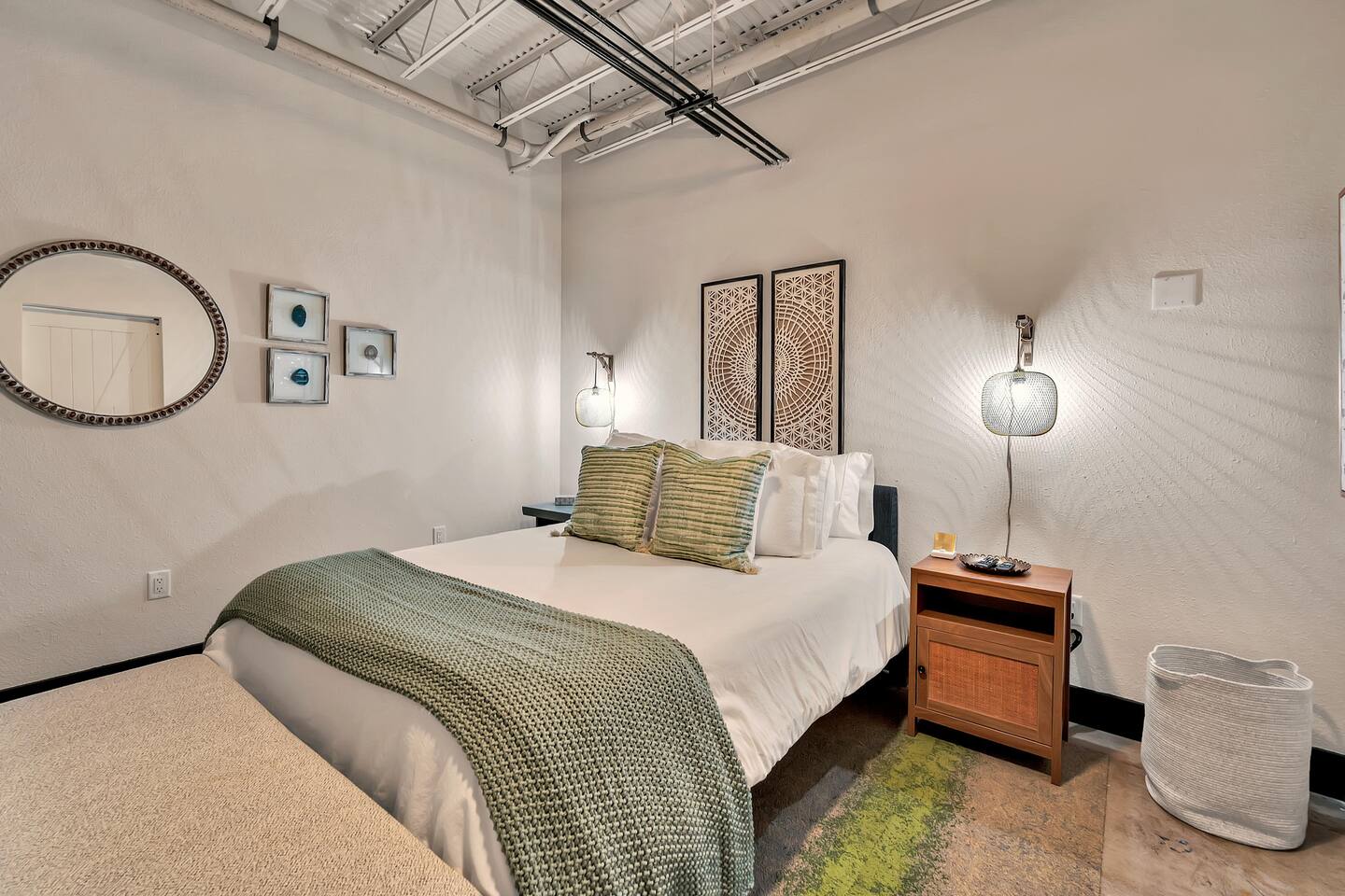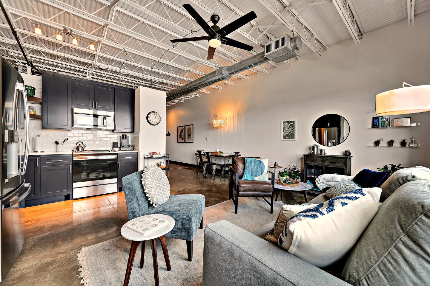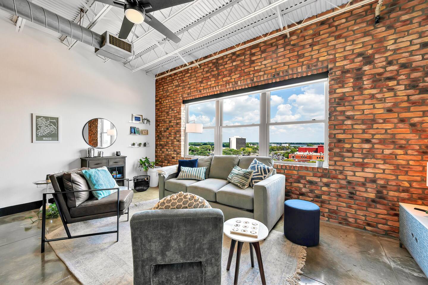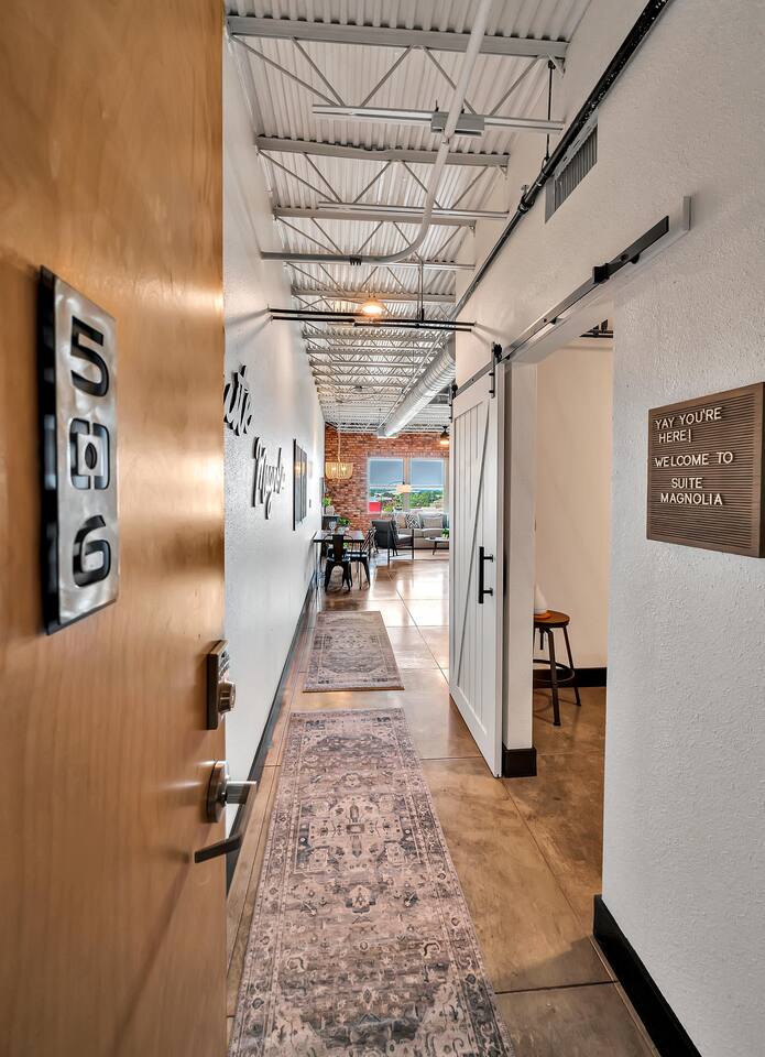 Located on the 5th floor of the historic Behrens Lofts, Suite Magnolia is a true gem of downtown Waco. Built in 1913 for the Behrens Drug Company and one of the few buildings to survive the 1953 Waco tornado, this loft preserves its industrial past while offering every modern convenience. The exposed concrete and vintage factory details blend seamlessly with chic, contemporary design, giving you a one-of-a-kind stay. Prime Location Stay within walking distance of Waco’s most famous spots, including the Silo District and Magnolia Market, as well as top restaurants and boutiques. Planning to catch a Baylor game or visit local museums? The shuttle, just two blocks away, makes it easy to visit McLane Stadium, the Texas Ranger Hall of Fame, and other attractions. What’s Inside The loft is thoughtfully designed to make you feel at home, whether you’re cooking up a meal in the fully stocked kitchen or relaxing in the spacious living room. With 2 comfortable beds (a queen and a full), new appliances, a coffee maker, and all the essentials, Suite Magnolia has everything you need for a relaxing and memorable stay. Ready to experience Waco like never before? Book Suite Magnolia for the perfect blend of history, luxury, and convenience.