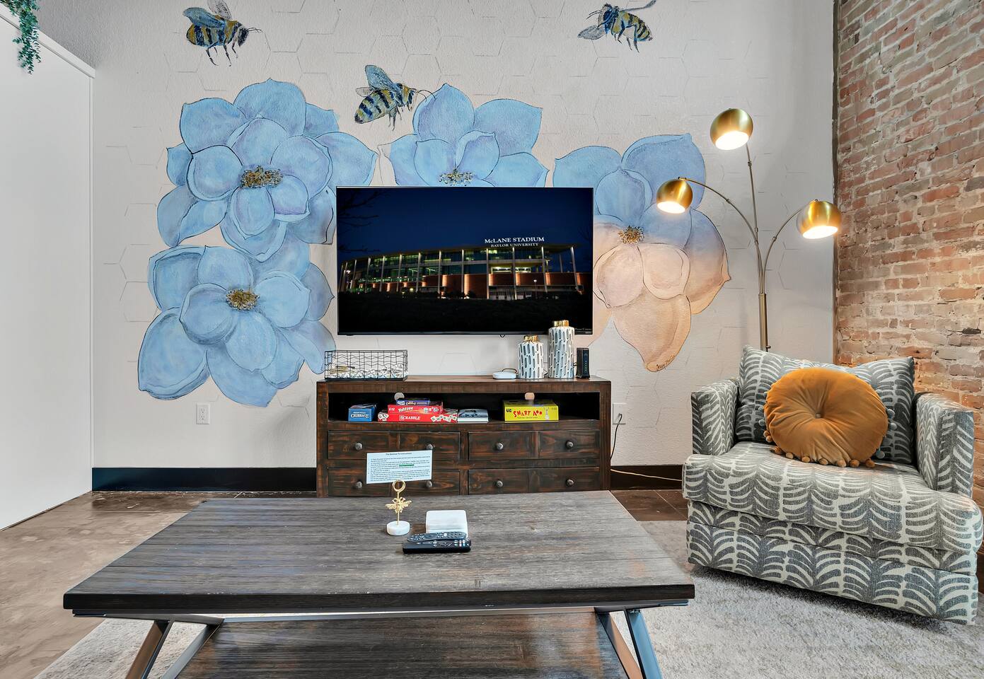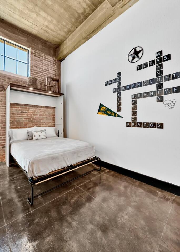 The Beehive Loft is a stylish 1-bed, 1-bath condo in downtown Waco that sleeps 4. Features include a murphy bed/desk combo, balcony views, exposed brick, and free parking—just minutes from Magnolia, Baylor, and all the best downtown spots.