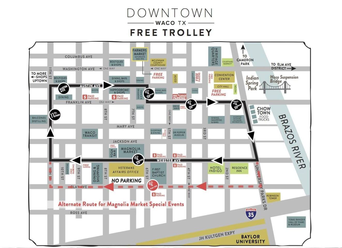 Silo District Trolley is free and runs every 15 minutes. The trolley’s route makes it easy to get to and from Magnolia Market, and also provides access to other popular shopping, dining and art venues in the downtown area. The "4th and Franklin" trolley stop is super close. Just exit the building, turn left on 4th St. and walk 1 block to Franklin St.