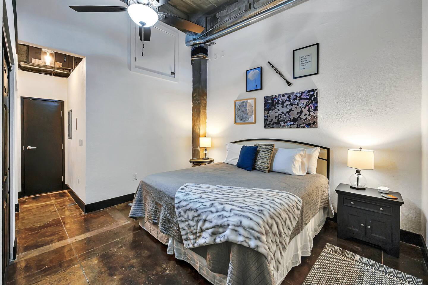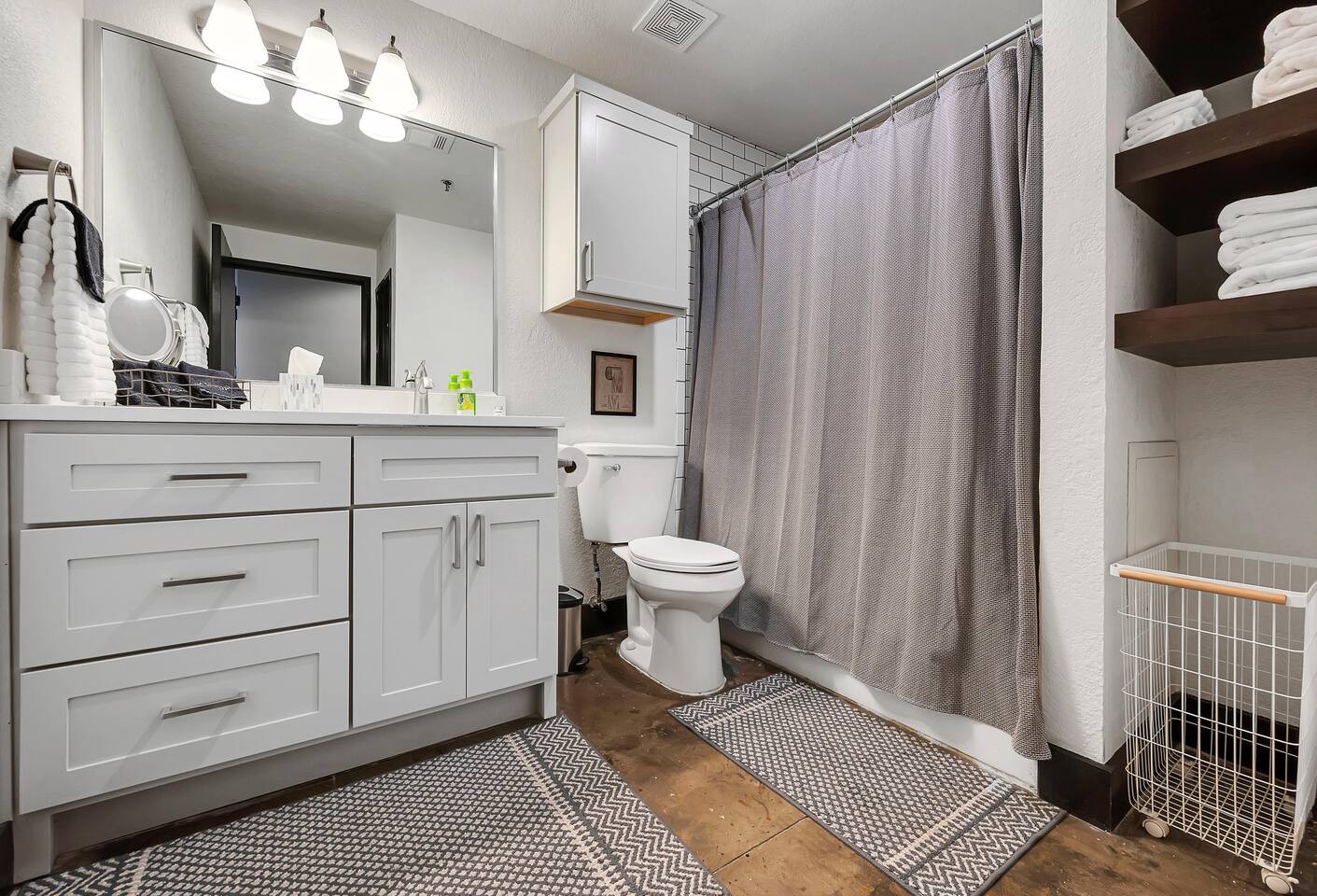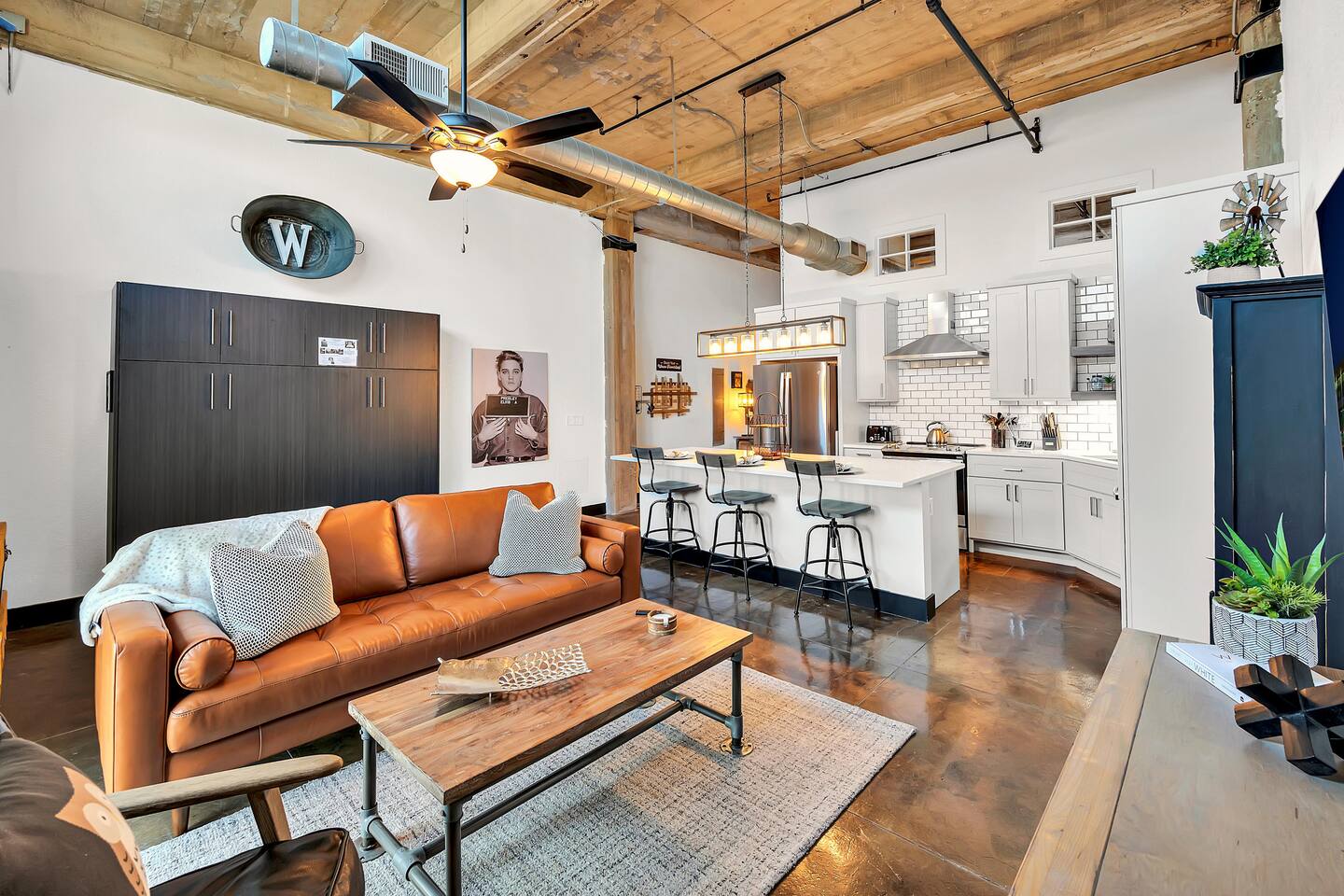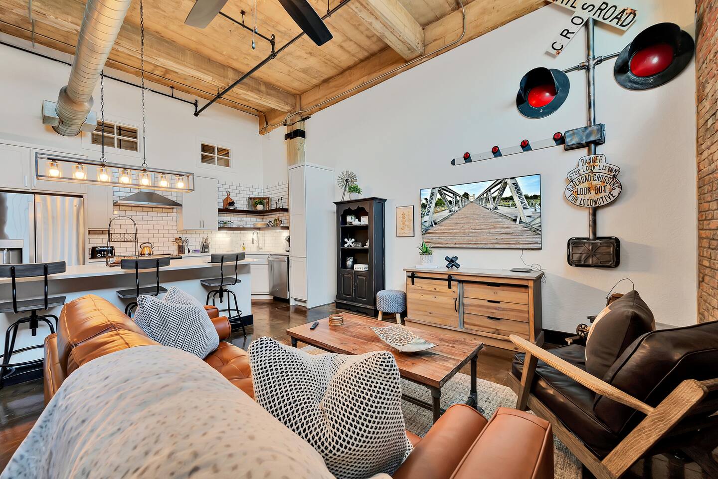 Extremely well appointed, “The Crossing at 202” features a full-size replica of a railroad crossing displayed on the wall as well as a railroad track corner ornament. Get a taste of the history of Dr. Pepper with the “Dr Pepper wall”. Enjoy the beautiful Waco weather with a balcony and sliding door. The family room features a 65- inch smart TV. The loft is equipped with high- speed internet access with free Wi-Fi throughout. Device charging stations are found bedside in the bedroom, luggage racks in the closet and a hair-dryers in the bathroom. Since this is a downtown location and so close to the Magnolia Silos, appropriately for “The Crossing”, occasionally you will hear the train two blocks away as it passes right by the Silos as well as other noises associated with a downtown area. Less than a mile from Baylor University and two blocks from the McLane Stadium shuttle pick up. Free on-site street parking at the building. STR Permit # STR000556-05-2022
