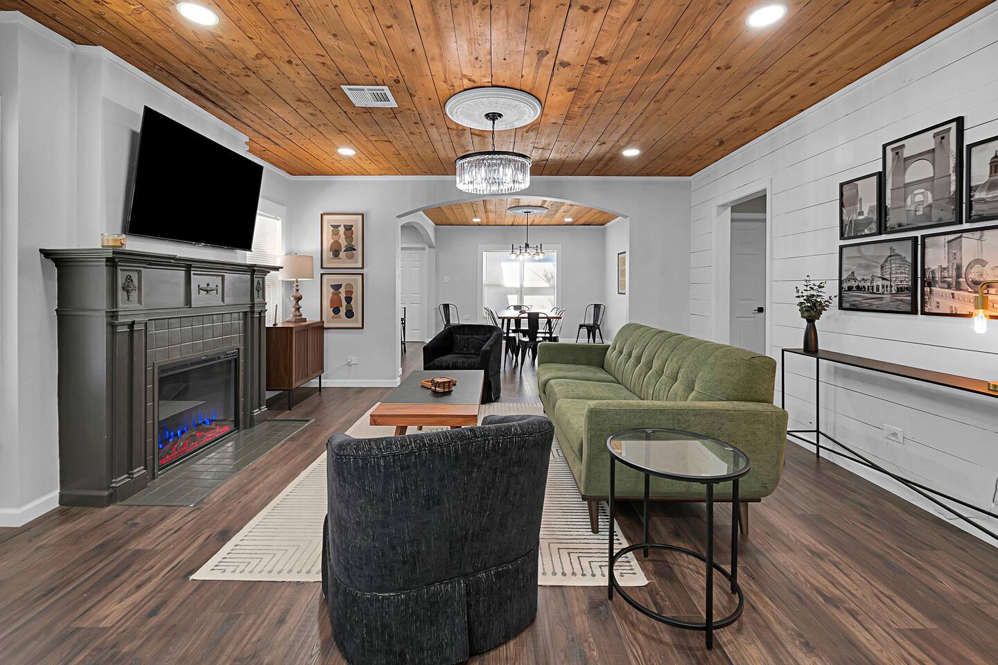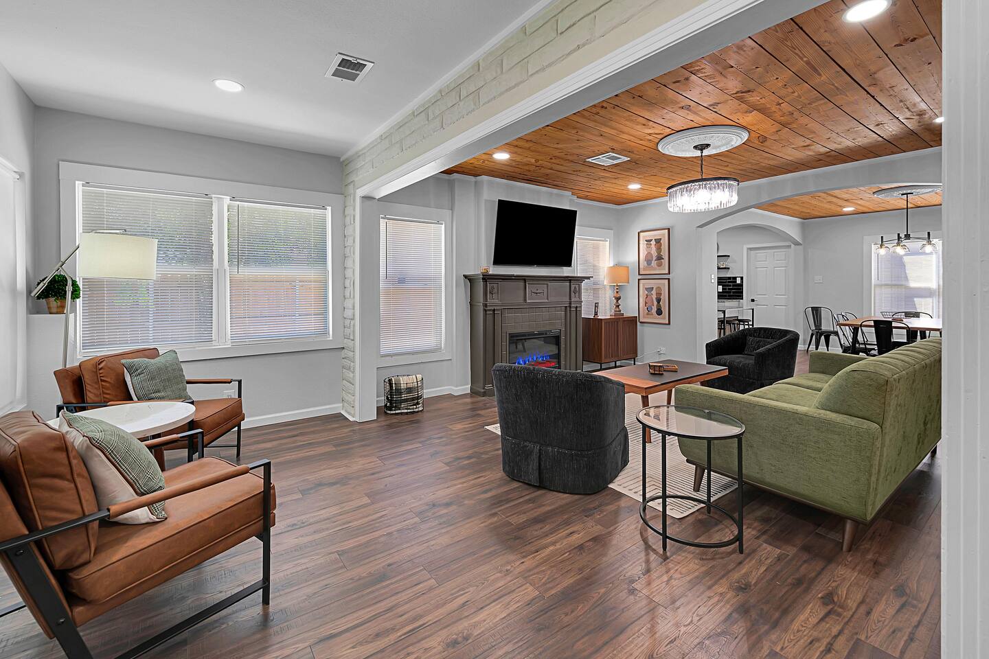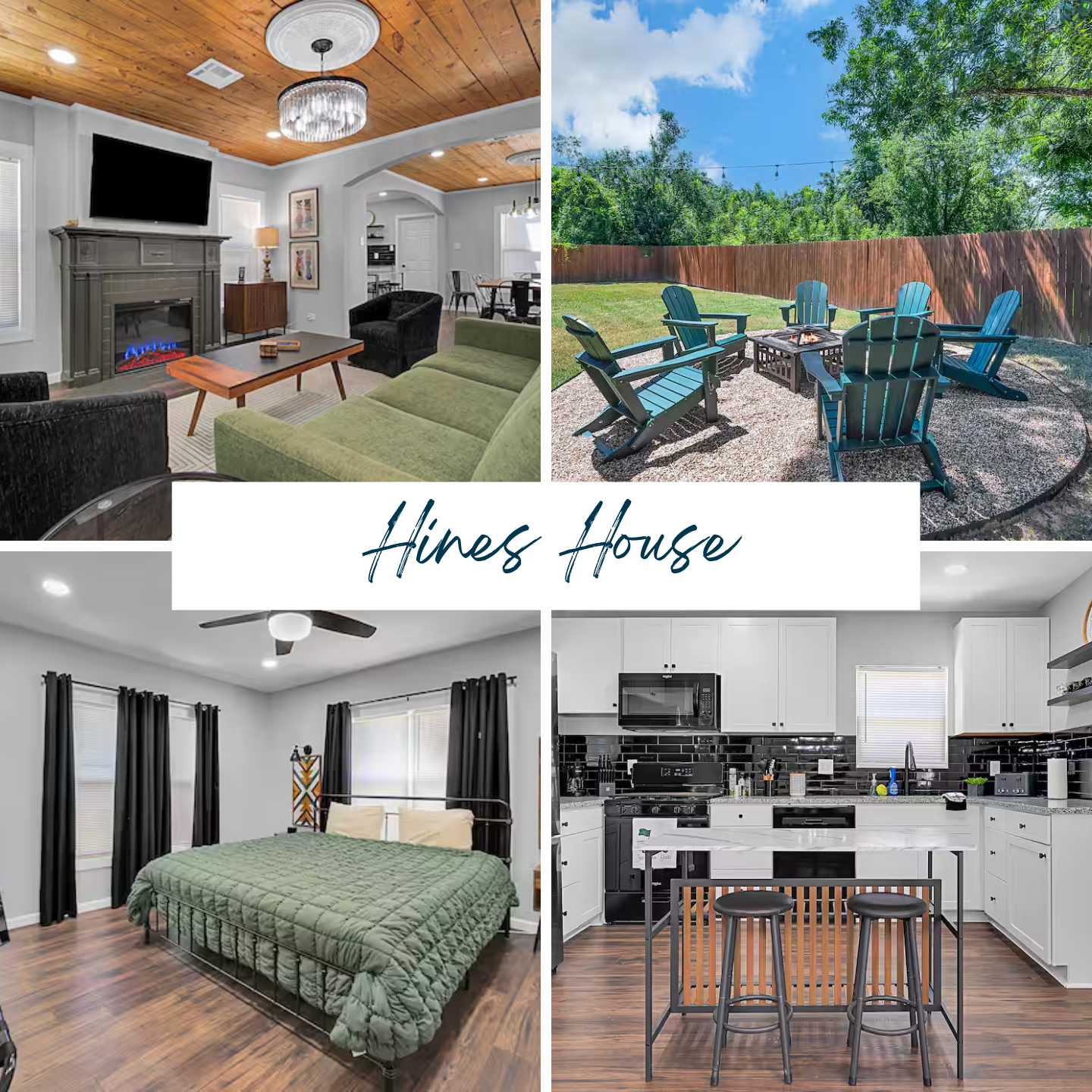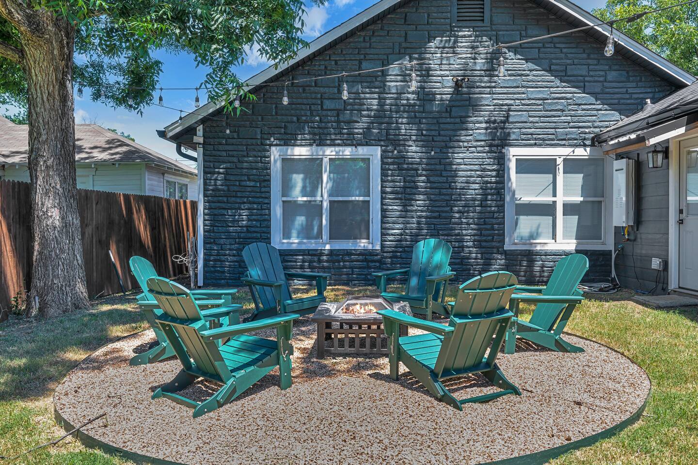 Step into the bright, open-concept living space—original shiplap, rustic wood ceilings, and a cozy new electric fireplace. The fully stocked kitchen features sleek black-and-white subway tile, granite countertops, and stainless steel appliances. Gather around the dining table for six, or relax in the spacious living area with a green velvet sofa and two inviting armchairs. Just off the main room, a bonus sitting area offers extra space to unwind in natural light—perfect for reading or morning coffee. A full-size washer and dryer are also available for your convenience. Each of the three bedrooms is designed for restful sleep, and both bathrooms have been thoughtfully updated with fresh finishes and modern fixtures. Backyard Escape The large, private backyard is perfect for enjoying Waco's beautiful evenings. String lights twinkle overhead as you sit around the fire pit, toast s’mores, or stargaze. There's plenty of room for yard games or simply lounging in the sun. Peace of Mind This home has been fully updated with new roofing, electrical, plumbing, and insulation—providing a safe, quiet, and comfortable stay. Location You’ll be close to all the best Waco has to offer: Baylor University – 17-minute walk or 3-minute drive Magnolia Market & Silos – A short drive away Dr Pepper Museum – Just minutes from your doorstep Cameron Park Zoo – A local favorite for family fun Whether you're visiting Waco for work, play, or a bit of both, this charming home offers a welcoming space to relax and recharge. Book your stay today and enjoy a perfect mix of location, comfort, and character! This is a brand new listing. Do not let the lack of reviews deter you! Check out our management page to read past reviews of fabulous stays with us. We are dedicated to providing quality stays. The Hines House is a beautiful property and is sure to be a favorite! License # STR-000532-05-2025