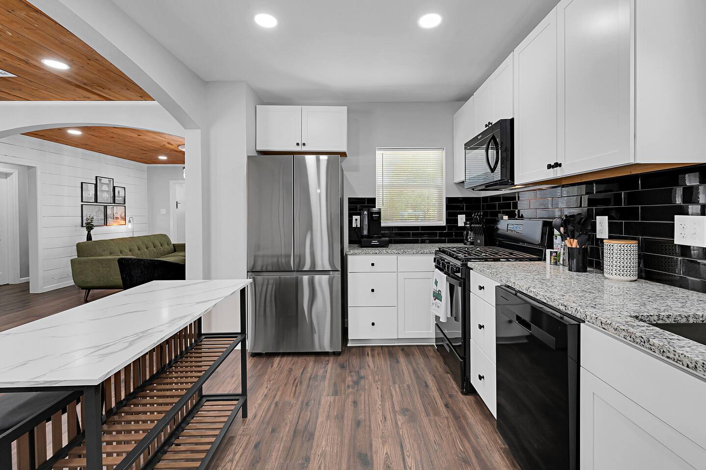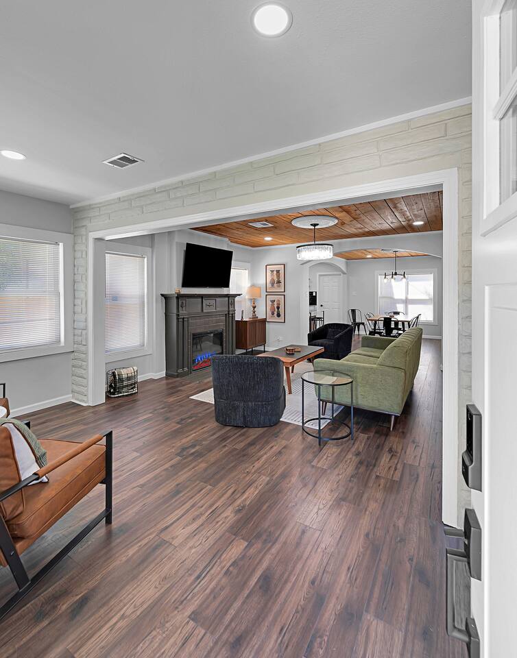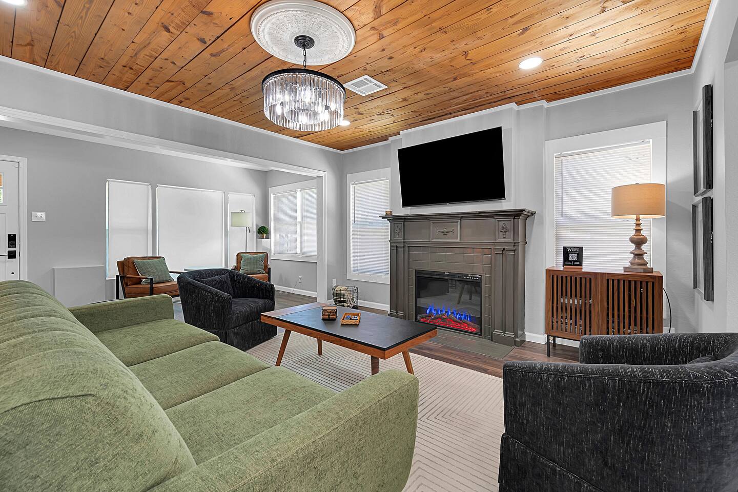 Step into the bright, open-concept living space—original shiplap, rustic wood ceilings, and a cozy new electric fireplace. The fully stocked kitchen features sleek black-and-white subway tile, granite countertops, and stainless steel appliances. Gather around the dining table for six, or relax in the spacious living area with a green velvet sofa and two inviting armchairs. Just off the main room, a bonus sitting area offers extra space to unwind in natural light—perfect for reading or morning coffee. A full-size washer and dryer are also available for your convenience. Each of the three bedrooms is designed for restful sleep, and both bathrooms have been thoughtfully updated with fresh finishes and modern fixtures. Backyard Escape The large, private backyard is perfect for enjoying Waco's beautiful evenings. String lights twinkle overhead as you sit around the fire pit, toast s’mores, or stargaze. There's plenty of room for yard games or simply lounging in the sun. Peace of Mind This home has been fully updated with new roofing, electrical, plumbing, and insulation—providing a safe, quiet, and comfortable stay. Location You’ll be close to all the best Waco has to offer: Baylor University – 17-minute walk or 3-minute drive Magnolia Market & Silos – A short drive away Dr Pepper Museum – Just minutes from your doorstep Cameron Park Zoo – A local favorite for family fun Whether you're visiting Waco for work, play, or a bit of both, this charming home offers a welcoming space to relax and recharge. Book your stay today and enjoy a perfect mix of location, comfort, and character! This is a brand new listing. Do not let the lack of reviews deter you! Check out our management page to read past reviews of fabulous stays with us. We are dedicated to providing quality stays. The Hines House is a beautiful property and is sure to be a favorite! License # STR-000532-05-2025