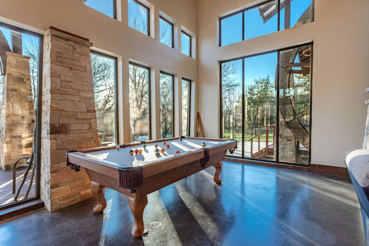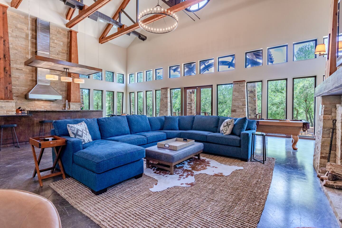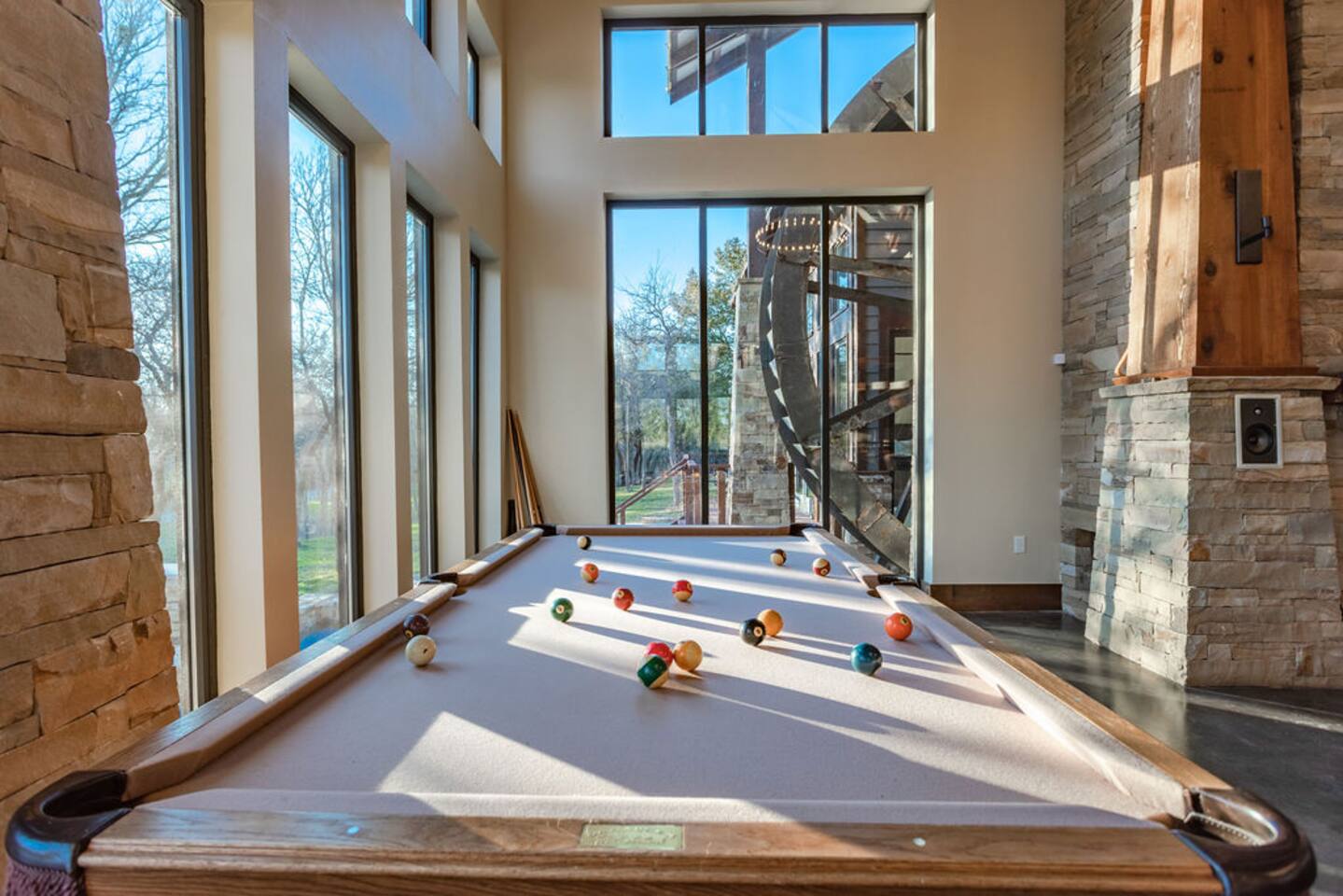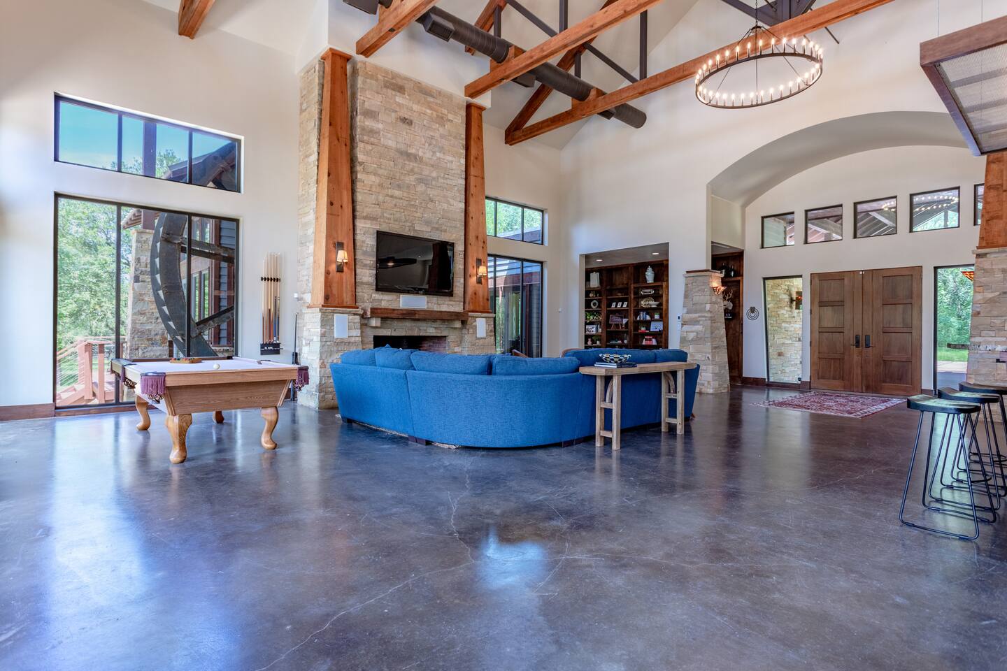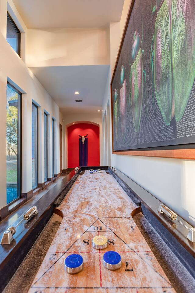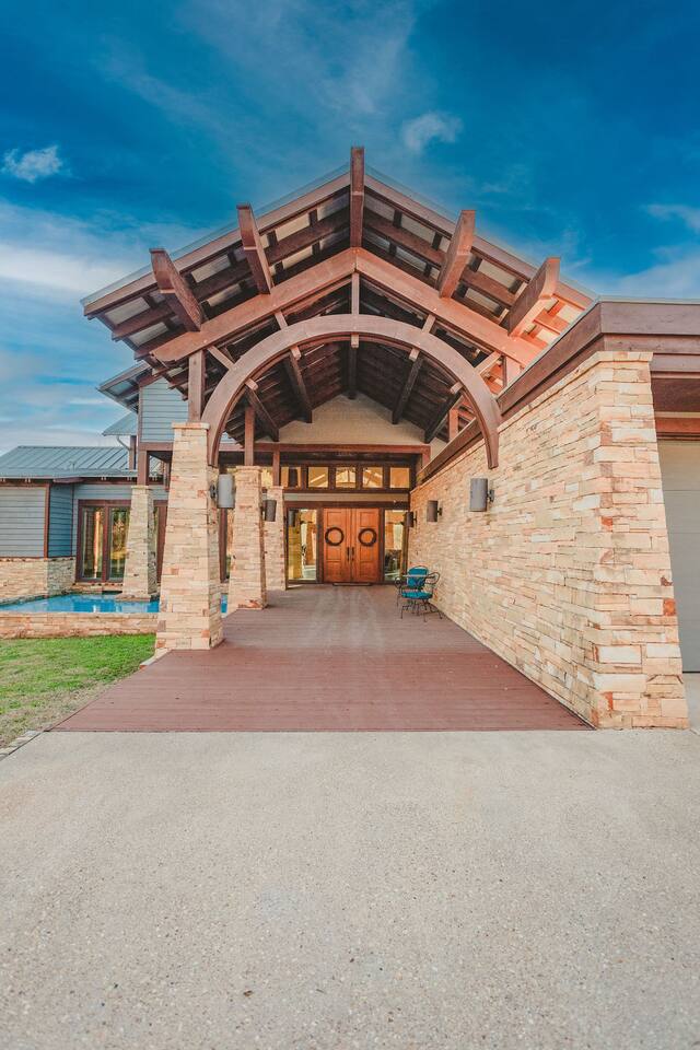 Step into the spacious living area featuring high ceilings framed by beautiful beams and sprawling windows framing panoramic views of the surrounding natural beauty. With 4 bedrooms and 4.5 bathrooms, our home offers a serene sanctuary for up to 14 guests. Sink into plush beds/bedding and wake up to the soothing sounds of the creek just outside. Each bedroom also includes an ensuite bathroom and 2 of the bedrooms house pull out couches for additional sleeping options. Relax and unwind in the spacious living area complete with pool & poker tables. Whether you're enjoying a movie night by the fireplace or hosting a gathering with loved ones, this inviting space sets the scene for unforgettable memories. Enjoy our fully equipped kitchen boasting modern appliances and ample counter space. Dine in style at the large dining table while taking in the views of the great outdoors. Step outside (with steaks in hand) to our charming bar and kitchen area. Grill up your favorite dishes while soaking in the ambiance of the surrounding nature. Don't forget to try your hand at fishing in the nearby creek, where you are welcome to cast a line and reel in the day's catch. Note: this creek water level depends the season and rainfall. We are conveniently located just 20 minutes from the vibrant city of Waco, TX. We feel our retreat offers the perfect blend of secluded serenity and easy access to local attractions. Explore the charm of downtown Waco, visit the iconic Magnolia Market, cheer on your favorite Baylor Bears or embark on outdoor adventures in the nearby parks. We are dedicated to ensuring that your stay exceeds expectations, and we're always available to assist with any questions or recommendations during your visit. This is a brand new listing for us, so do not worry about the lack of reviews! Check out our hosting rating & see our past guest reviews. We are local & love to see happy guests! Escape the hustle and bustle of everyday life and experience the ultimate in relaxation and luxury at our stunning creekside retreat. Book your stay with us today and make unforgettable memories in this beautiful oasis!