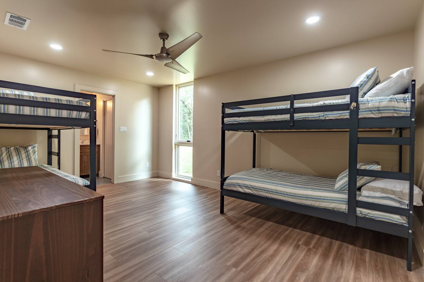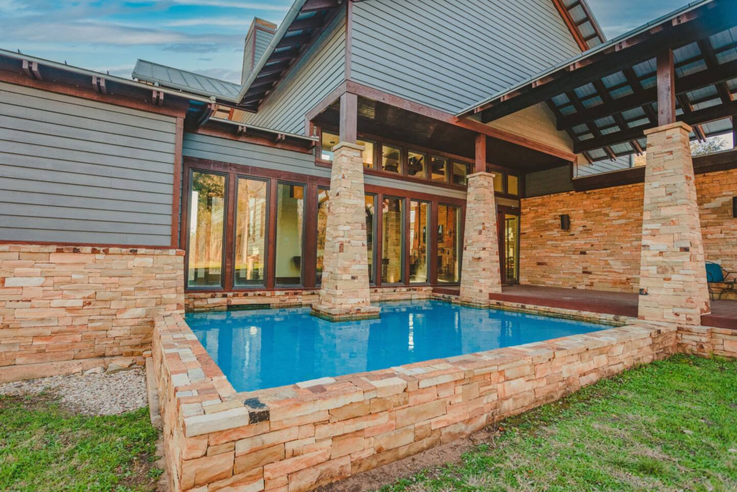 The water features surrounding the house are for aesthetic purposes and are only shin deep. Guests are welcome to sit in the water, but they are not made for swimming. Bedroom 1 & 2 have 1 King bed plus 1 Queen pullout couch. Bedroom 3 is a queen bed Bedroom 4 has 2 twin size bunks beds for a total of 4 beds. No smoking, no pets (please respect our policy!) Fishing is allowed water level permitting. Must be 21 or older to book.